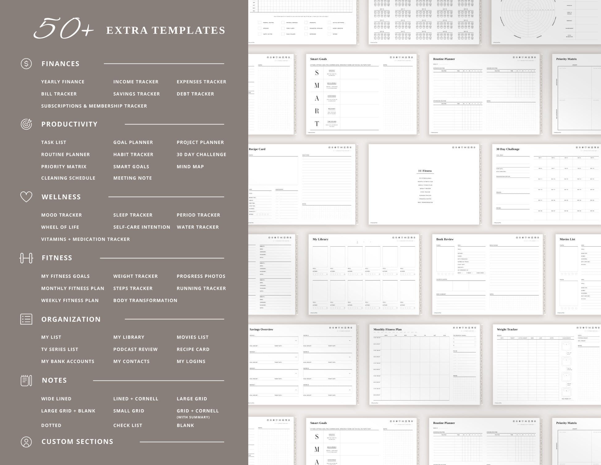✔︎ Over 50+ extra templates (finance, productivity, wellness, fitness, organization, notes, custom section).