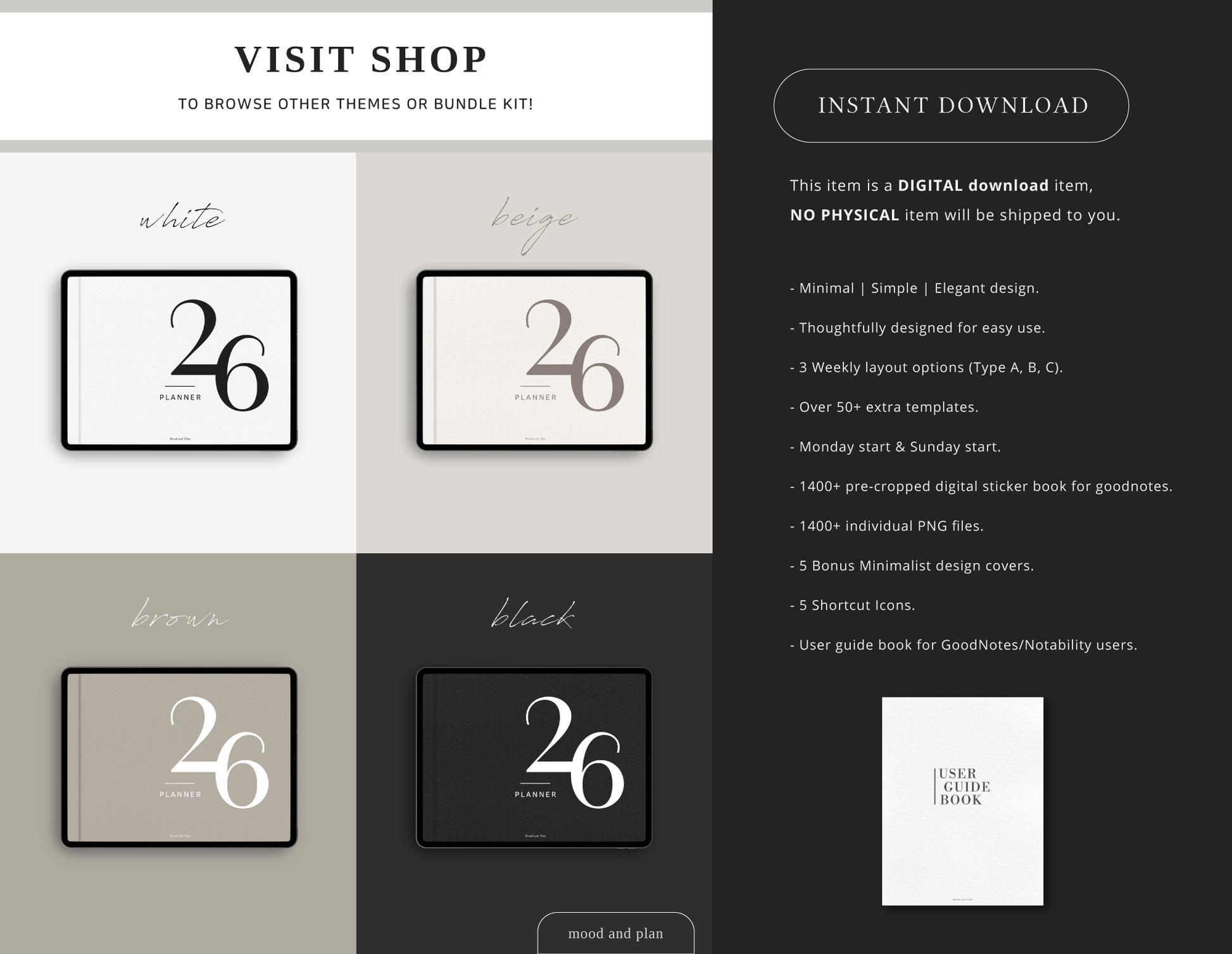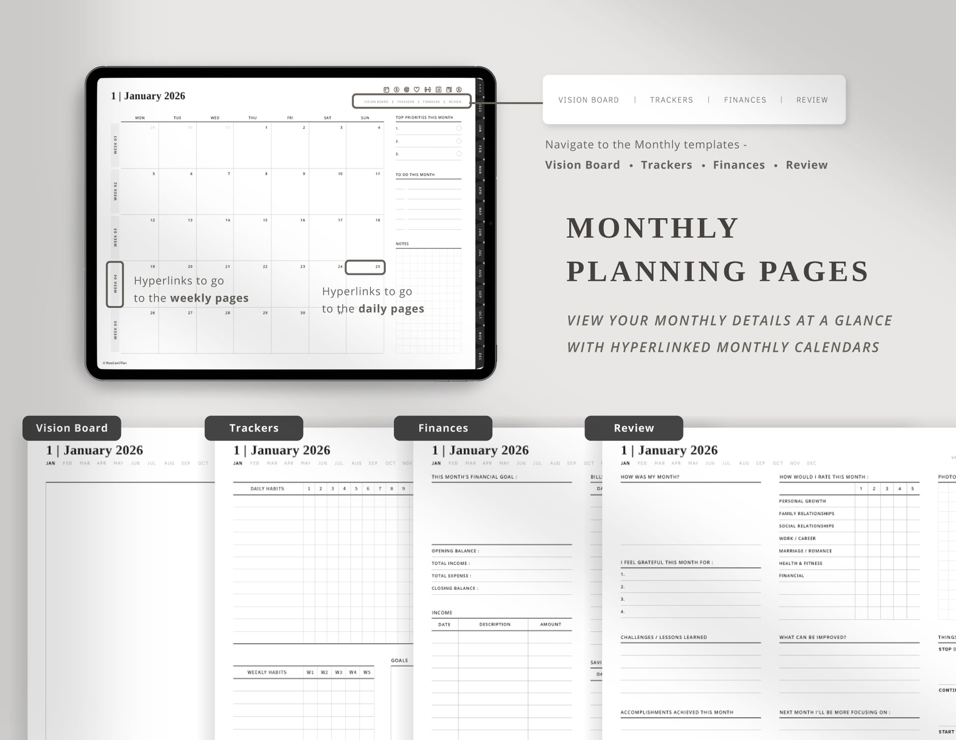 Fully hyperlinked and designed for effortless navigation, this planner combines minimal, modern, and simple aesthetics with ultimate functionality. Choose from 2 versatile weekly layouts and access 50+ extra templates covering finance, productivity, wellness, fitness, and organization.Â