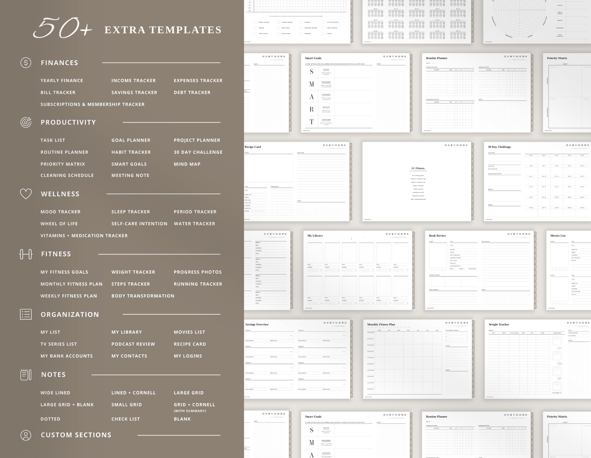 ✔︎ Over 50+ extra templates (finance, productivity, wellness, fitness, organization, notes, custom section).