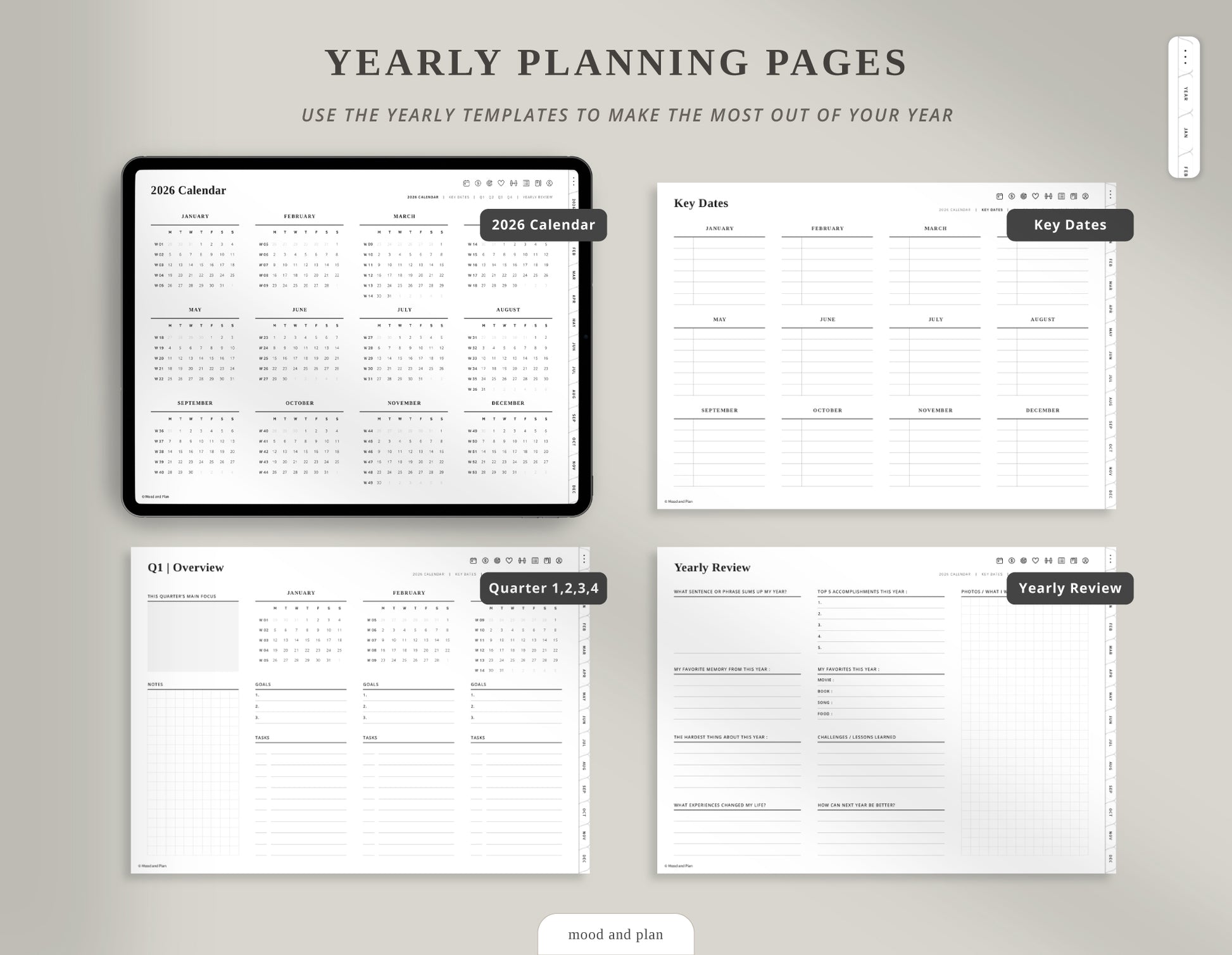 Fully hyperlinked and designed for effortless navigation, this planner combines minimal, modern, and simple aesthetics with ultimate functionality. Choose from 2 versatile weekly layouts and access 50+ extra templates covering finance, productivity, wellness, fitness, and organization.Â